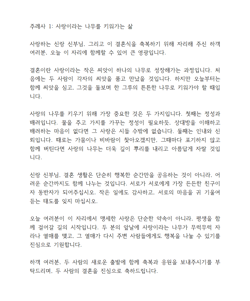 오늘 여러분이 이 자리에서 맹세한 사랑은 단순한 약속이 아니라, 평생을 함께 걸어갈 길의 시작입니다. 두 분의 앞날에 사랑이라는 나무가 무럭무럭 자라나 열매를 맺고, 그 열매가 다시 주변 사람들에게도 행복을 나눌 수 있기를 진심으로 기원합니다.