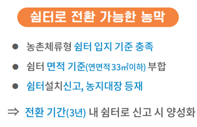 전환(유예) 기간 3년 이내에 농촌 체류형 쉼터 설치 절차를 이행할 경우 양성화 가능