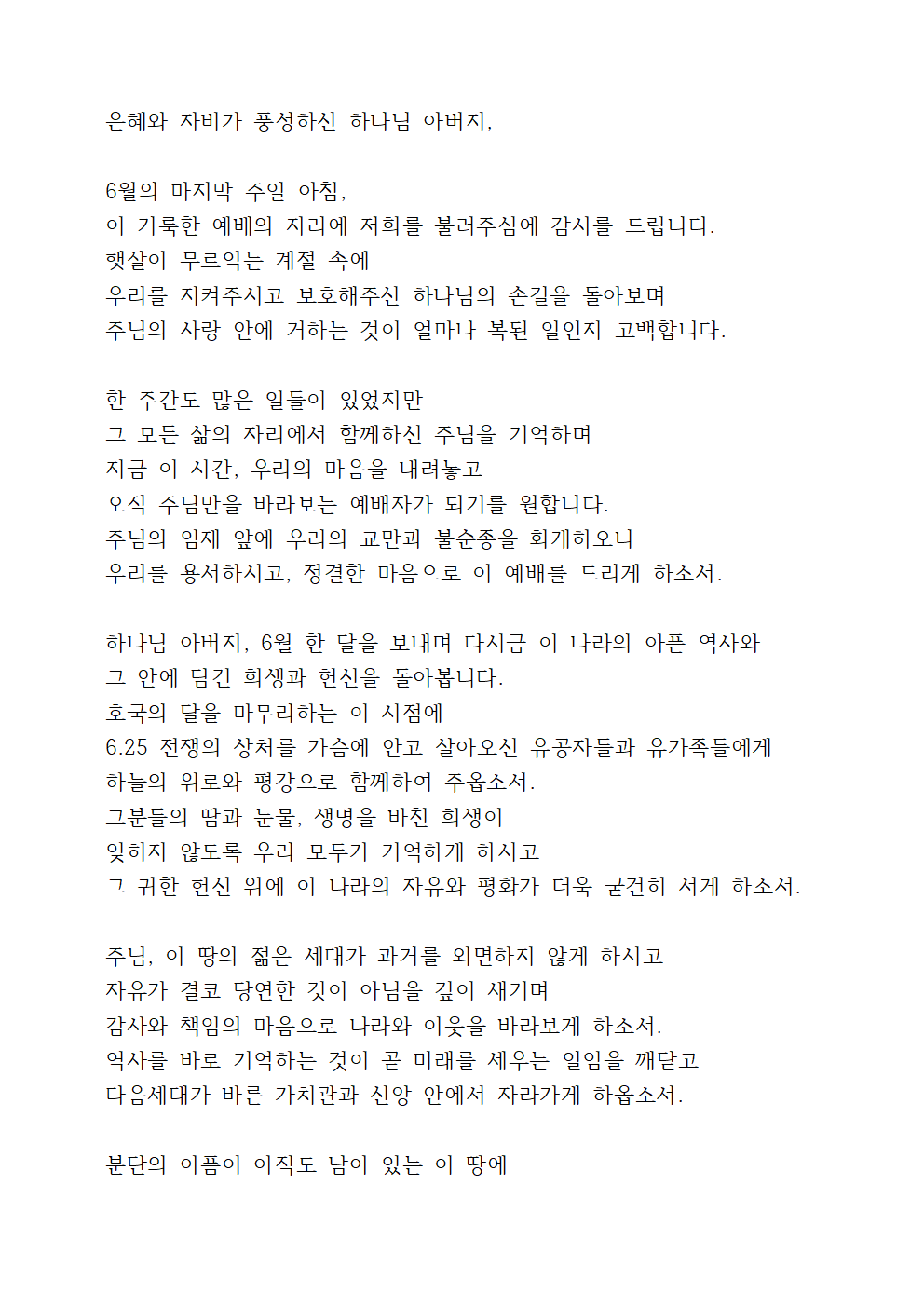 하나님 아버지, 6월 한 달을 보내며 다시금 이 나라의 아픈 역사와