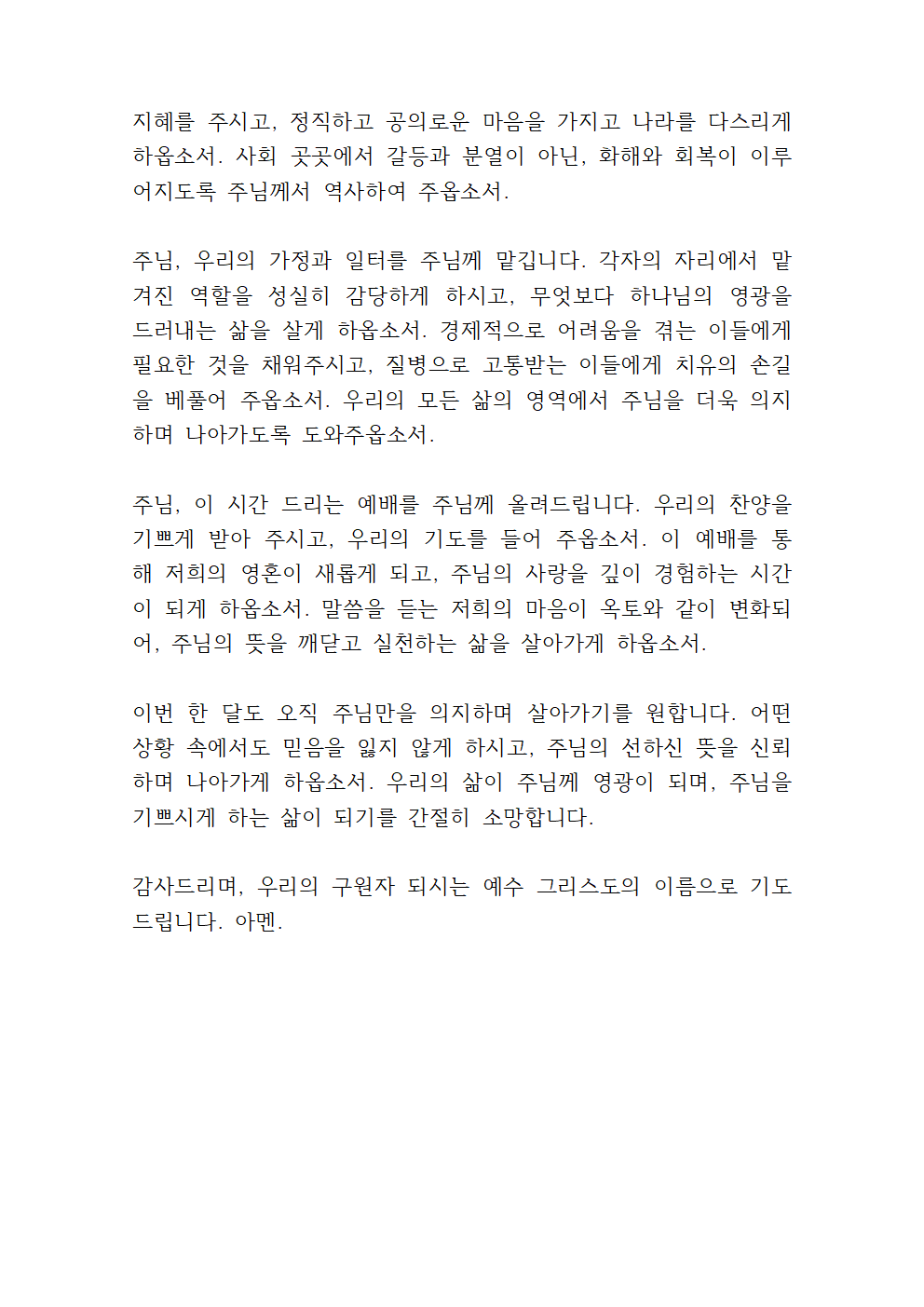 아버지, 이 시간 나라와 민족을 위해 간절히 기도드립니다. 여전히 혼란스럽고 분열된 이 땅을 불쌍히 여겨 주시고, 주님의 평화와 공의로 다스려 주옵소서. 이 나라의 지도자들에게 주님의 지혜와 사랑을 부어 주셔서, 국민을 섬기고 올바른 결정을 내릴 수 있도록 인도하여 주옵소서. 국민 모두가 갈등과 대립이 아닌 화합과 이해의 길로 나아가며, 서로를 존중하고 돕는 사랑의 공동체를 이루게 하옵소서.