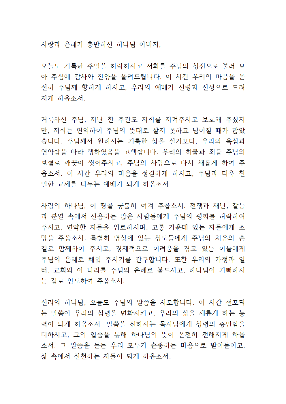 진리의 하나님, 오늘도 주님의 말씀을 사모합니다. 이 시간 선포되는 말씀이 우리의 심령을 변화시키고, 우리의 삶을 새롭게 하는 능력이 되게 하옵소서. 말씀을 전하시는 목사님에게 성령의 충만함을 더하시고, 그의 입술을 통해 하나님의 뜻이 온전히 전해지게 하옵소서. 그 말씀을 듣는 우리 모두가 순종하는 마음으로 받아들이고, 삶 속에서 실천하는 자들이 되게 하옵소서.