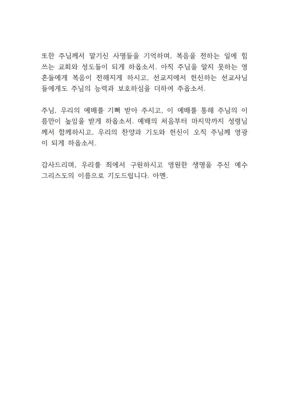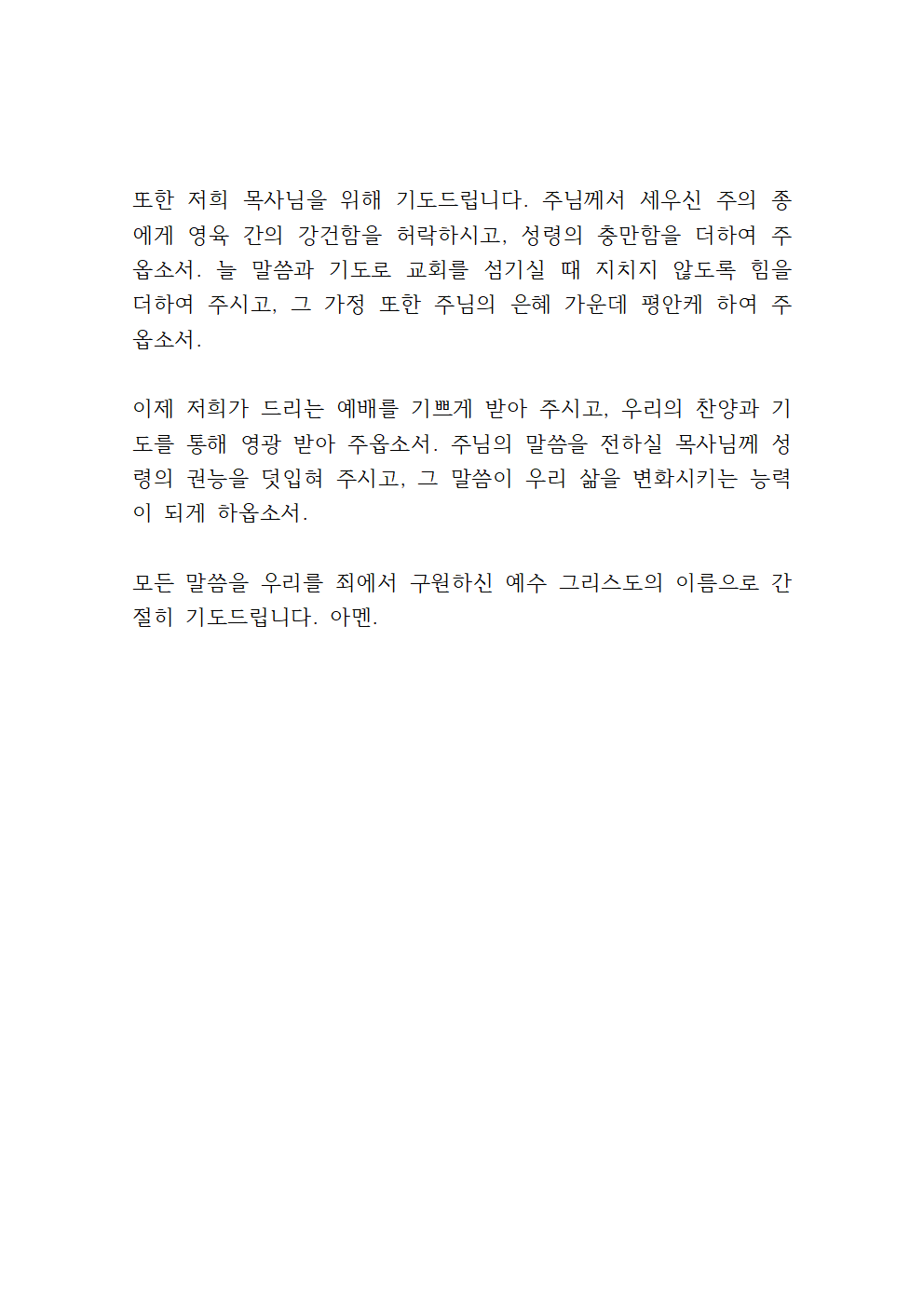주님, 우리의 예배를 기뻐 받아 주시고, 이 예배를 통해 주님의 이름만이 높임을 받게 하옵소서. 예배의 처음부터 마지막까지 성령님께서 함께하시고, 우리의 찬양과 기도와 헌신이 오직 주님께 영광이 되게 하옵소서.