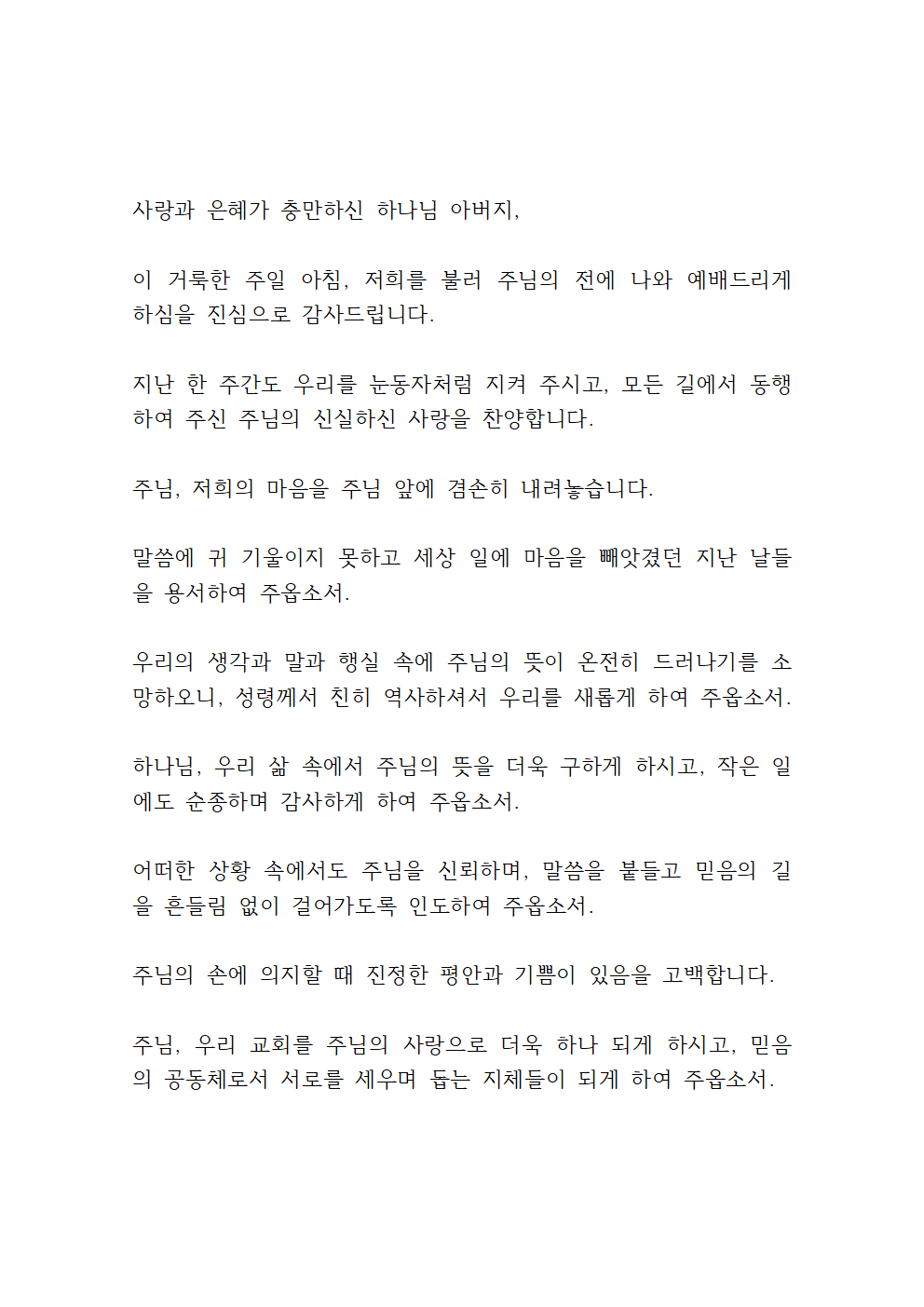 오늘 드리는 이 예배를 통하여 우리의 삶이 주님께 더욱 가까이 나아가고, 주님의 뜻을 깨닫고 순종하며 살아가는 새로운 결단의 시간이 되게 하옵소서. 예배의 자리마다 주님의 임재가 충만하게 하시고, 돌아가는 모든 발걸음 위에 주님의 평강과 은혜가 함께하게 하옵소서.