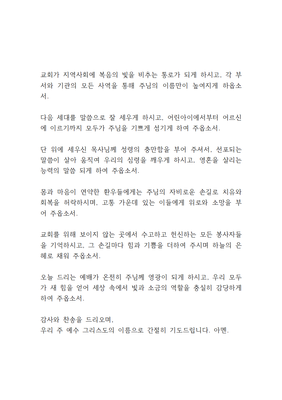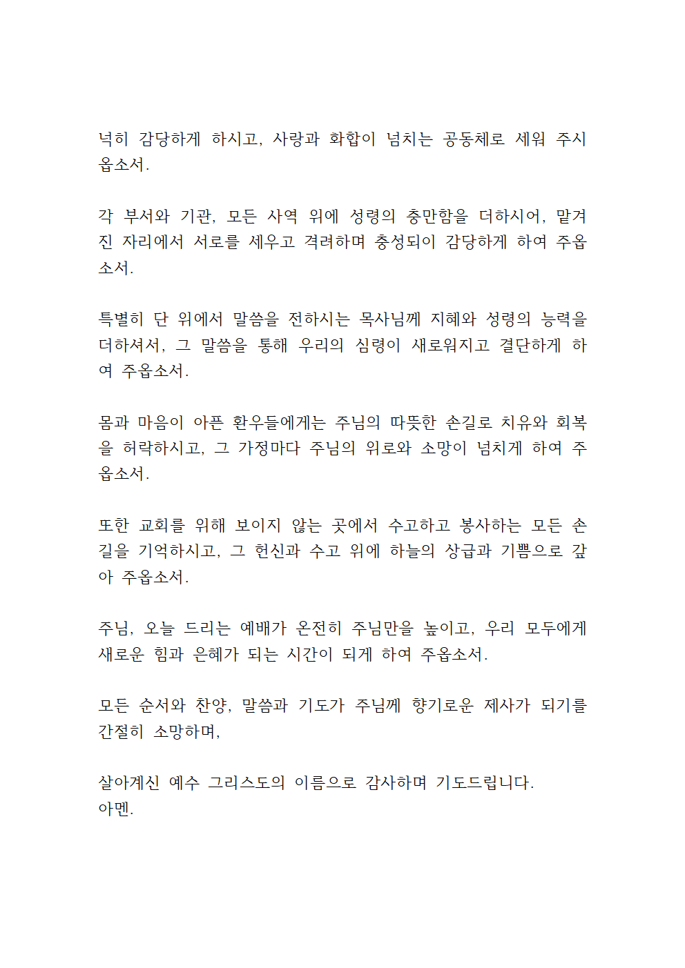 주님, 교회의 각 부서와 자리에서 묵묵히 섬기는 모든 봉사자들을 기억해 주옵소서. 그들의 작은 헌신 하나하나를 귀히 보시고, 하늘의 위로와 상급으로 채워 주시며, 섬김 속에서 기쁨과 감사가 넘치도록 축복해 주옵소서.