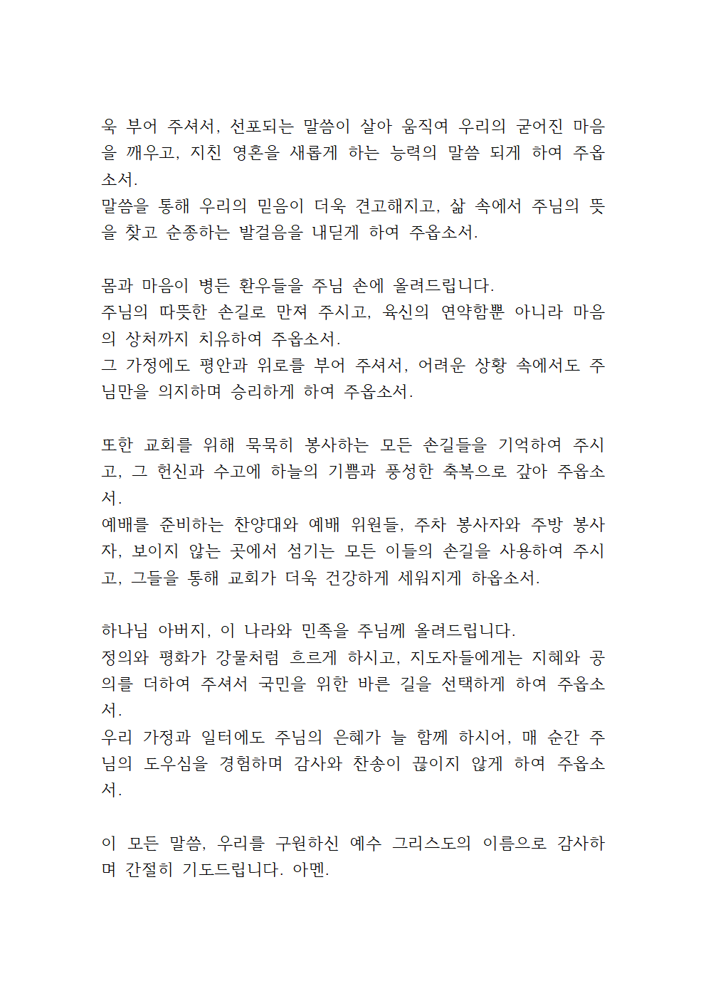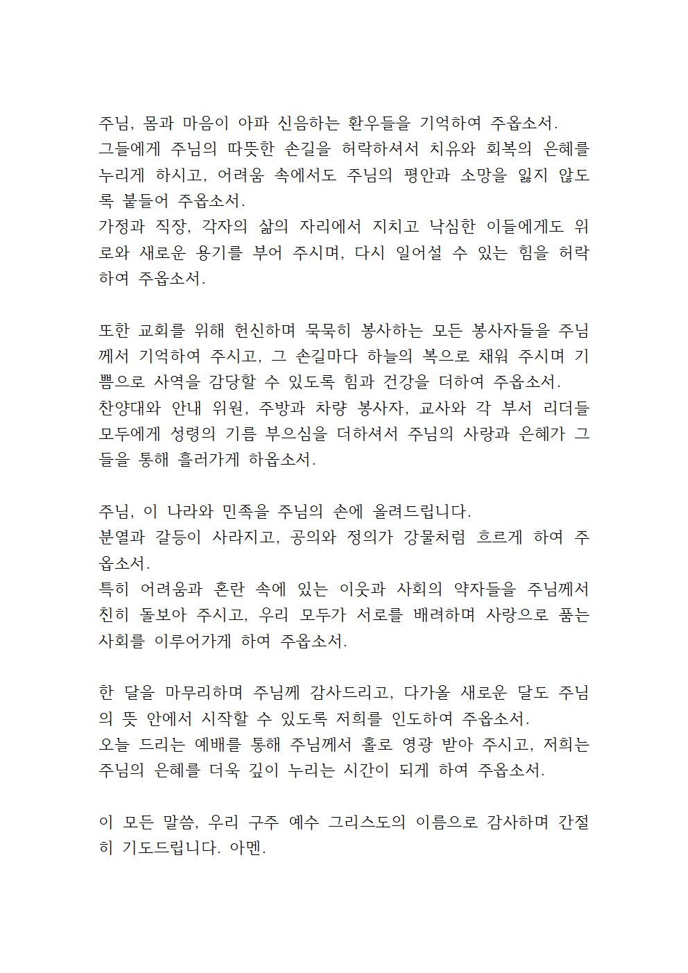 또한 육체적 고통과 질병으로 어려움 가운데 있는 환우들을 위해 기도드립니다. 주님의 치유의 손길로 그들의 몸과 마음을 만져 주시고, 그들에게 참된 평안과 회복을 허락하여 주옵소서. 함께하는 가족들에게도 믿음과 위로를 부어 주셔서 주님의 도우심을 신뢰하며 소망 중에 견디게 하소서.