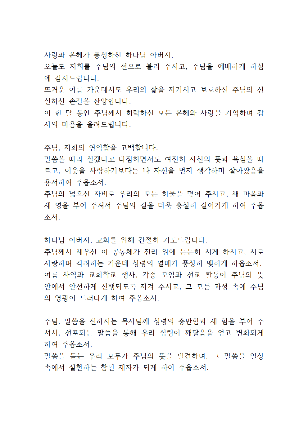 이번 기도문은 7월 한 달을 살아가는 우리 모두가 무더위 속에서도 신앙의 자리를 굳게 지키며, 주님의 뜻 안에서 새 힘을 얻고자 하는 고백으로 드리면 좋겠습니다.