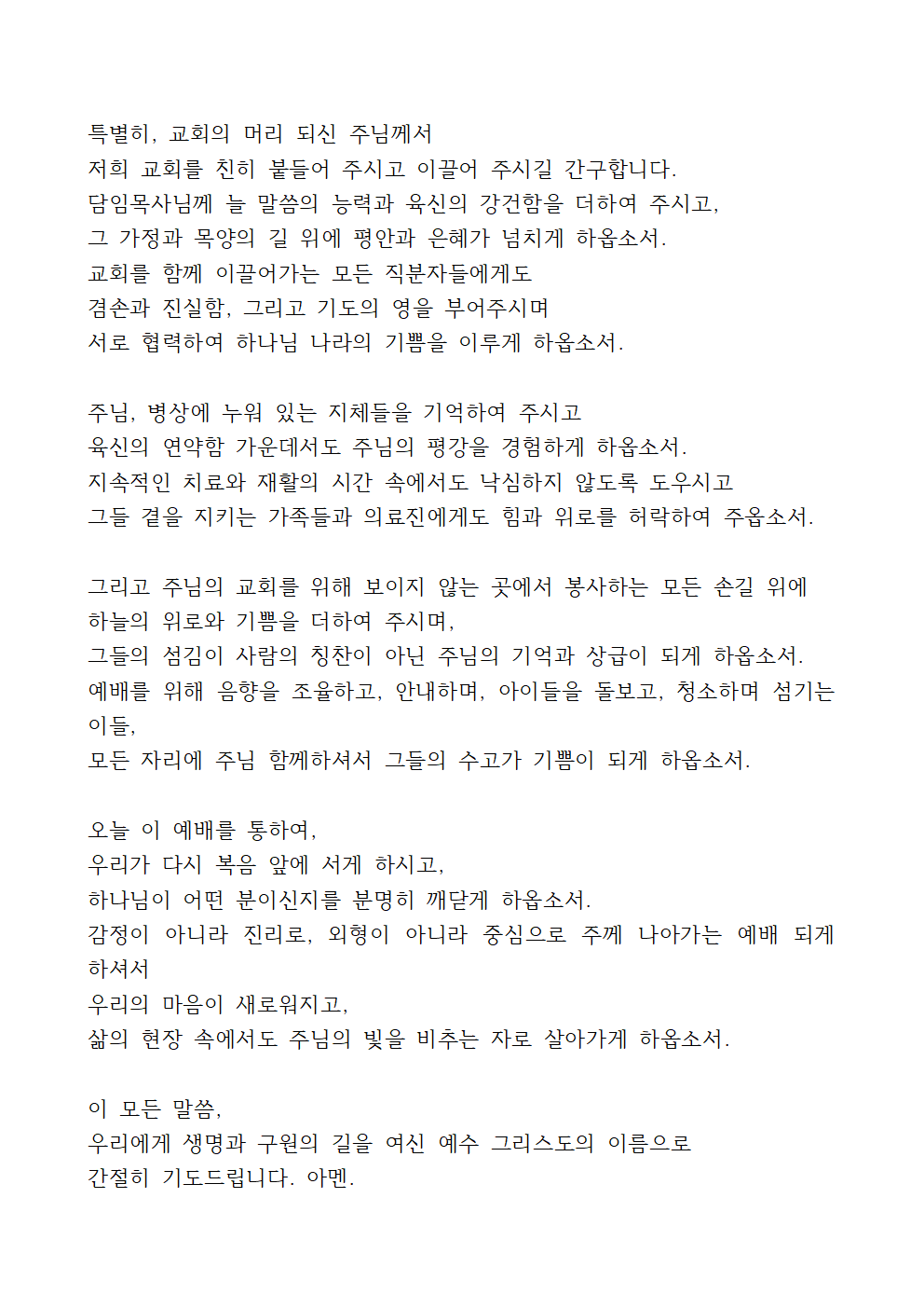 특별히, 교회의 머리 되신 주님께서 저희 교회를 친히 붙들어 주시고 이끌어 주시길 간구합니다. 담임목사님께 늘 말씀의 능력과 육신의 강건함을 더하여 주시고, 그 가정과 목양의 길 위에 평안과 은혜가 넘치게 하옵소서. 교회를 함께 이끌어가는 모든 직분자들에게도 겸손과 진실함, 그리고 기도의 영을 부어주시며 서로 협력하여 하나님 나라의 기쁨을 이루게 하옵소서.