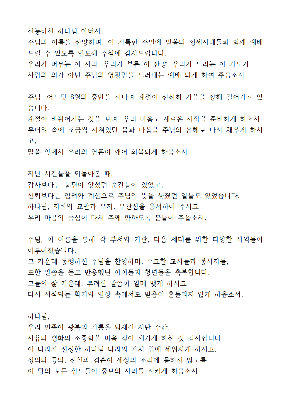 하나님, 우리 민족이 광복의 기쁨을 되새긴 지난 주간, 자유와 평화의 소중함을 마음 깊이 새기게 하신 것 감사합니다. 이 나라가 진정한 하나님 나라의 가치 위에 세워지게 하시고, 정의와 공의, 진실과 겸손이 세상의 소리에 묻히지 않도록 이 땅의 모든 성도들이 중보의 자리를 지키게 하옵소서.